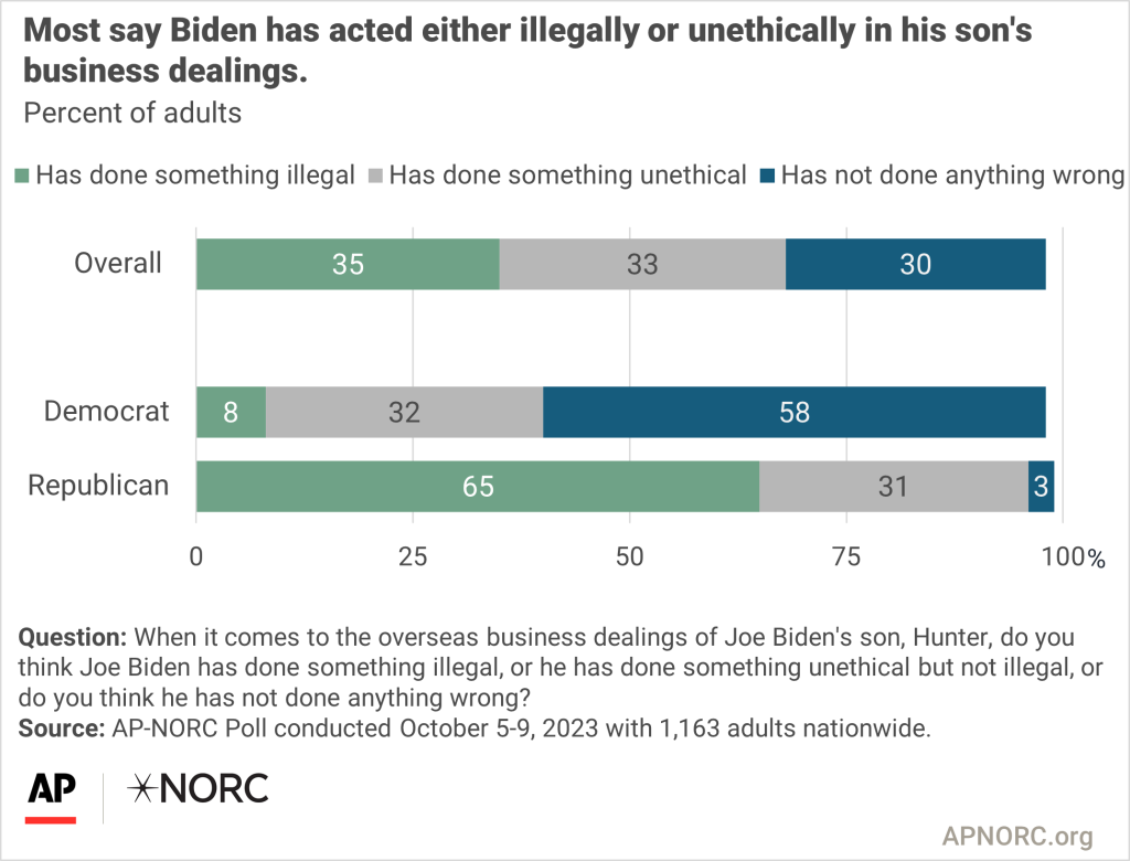 The War Between Israel and Hamas Marist College Institute for Public Opinion Americans Favor U.S. Support of Israel in War with Hamas... Fear Broader Conflict in the Region Most say Biden has acted either illegally or unethically in his son’s business dealings AP-NORC Center for Public Affairs Research Most adults say President Biden has at the very least acted unethically in his handling of the international business dealings of his son Hunter, including about a third who say he did something illegal. Only 30% of the public think Biden has done nothing wrong regarding Hunter’s business dealings.
