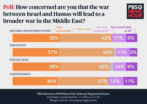 Most Americans fear broader conflict may arise from war between Israel and Hamas Laura Santhanam, PBS NewsHour Nearly eight in 10 Americans fear the war that erupted this week between Israel and Hamas will lead to a broader war in the Middle East, according to the latest PBS NewsHour/NPR/Marist poll.