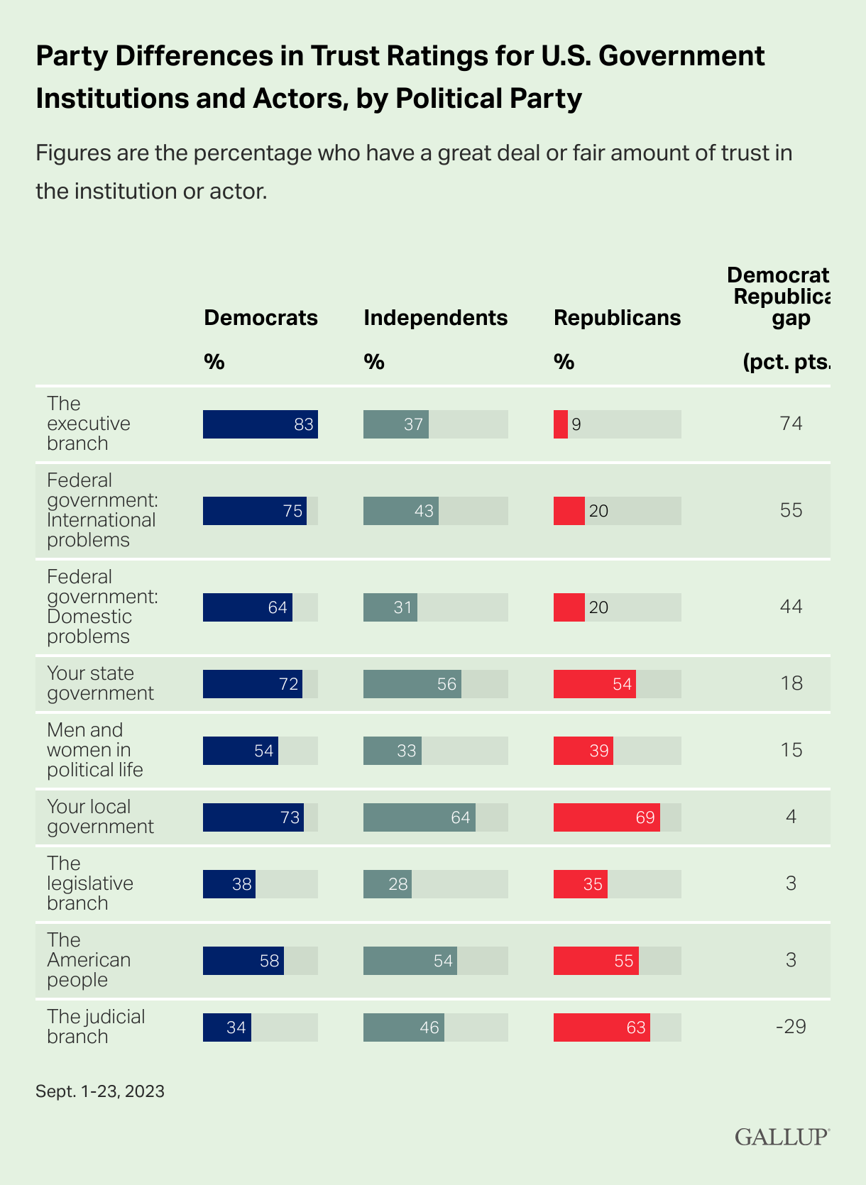 Hunter Biden investigations lead to ethical concerns about President Biden, an AP-NORC poll shows Josh Boak & Linley Sanders, Associated Press Ethical concerns are casting a shadow over President Biden as he seeks reelection amid investigations into his son Hunter and an impeachment inquiry, with a poll showing that 35% of U.S. adults believe the president himself has done something illegal. Americans Trust Local Government Most, Congress Least Jeffrey M. Jones, Gallup Gallup’s annual update on trust in government institutions and actors finds Americans have the most faith in local government (67%) and the least faith in the legislative branch of the federal government, or Congress (32%).