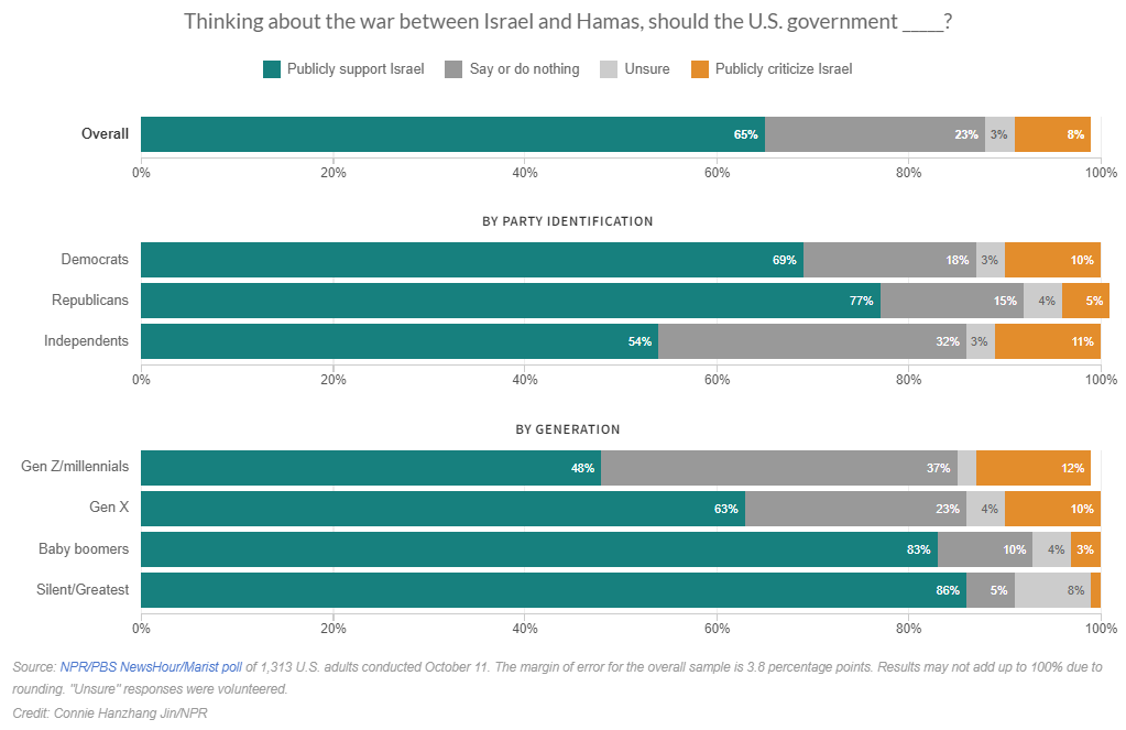 Americans strongly support Israel, but there are generational and racial divides Domenico Montanaro, NPR News In a new NPR/PBS NewsHour/Marist poll, public opinion about Israel in its war with Hamas is supportive, though the role of the U.S. in the region isn't as clear as Biden faces sharp disapproval.