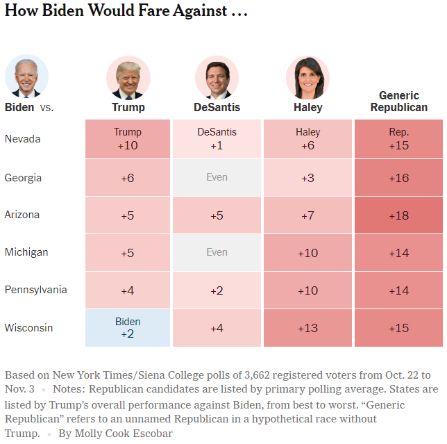 Trump Indictments Haven’t Sunk His Campaign, but a Conviction Might Jonathan Swan, Ruth Igielnik & Maggie Haberman, New York Times Polls by The New York Times and Siena College show his strength in key swing states, in part because of concerns about President Biden’s age. But a conviction could be the difference in 2024.