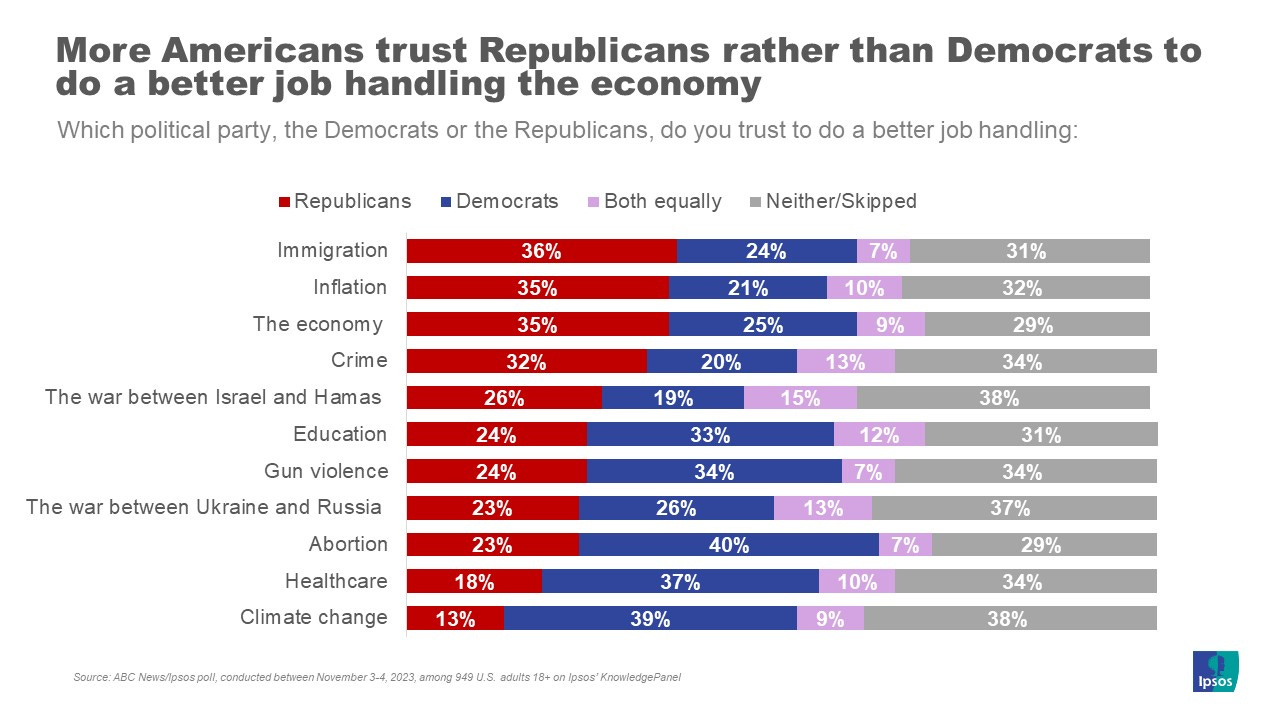Republicans perceived as better at handling the economy Mallory Newall & Sarah Feldman, Ipsos The Republican Party is currently more trusted to do a better job of handling the economy, inflation, and crime, while Democrats hold an advantage in dealing with gun violence, education, and healthcare, according to a new ABC News/Ipsos poll of American adults age 18+.