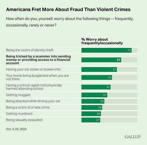 Nearly half of Americans think the US is spending too much on Ukraine aid Seung Min Kim & Linley Sanders, Associated Press As lawmakers in Washington weigh sending billions more in federal support to Kyiv to help fight off Russian aggression, close to half of the U.S. public thinks the country is spending too much on aid to Ukraine, according to polling from The Associated Press-NORC Center for Public Affairs Research. Scams: Relatively Common and Anxiety-Inducing for Americans Lydia Saad, Gallup Financial scams are among the most common crimes affecting U.S. adults in 2023, with 15% saying at least one member of their household has fallen prey, including 8% reporting that it has happened to themselves personally.