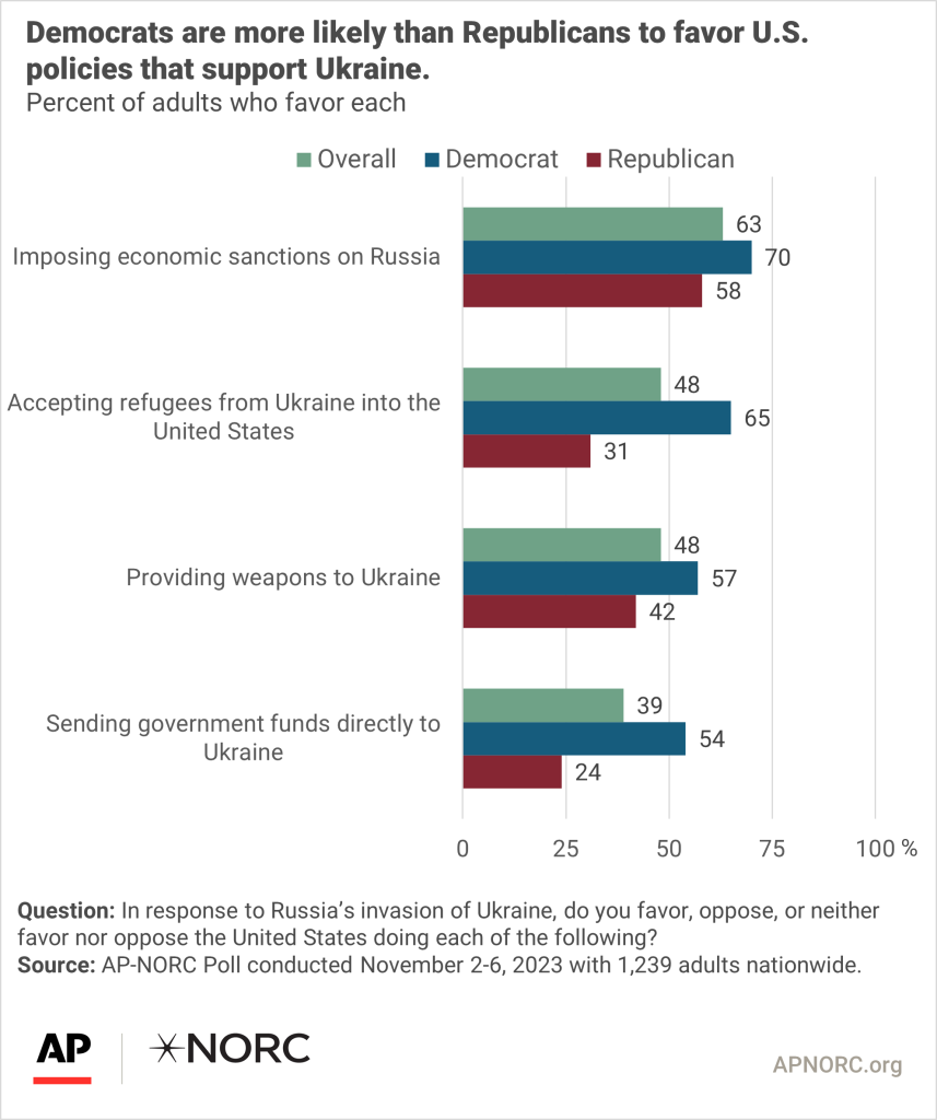 Most support economic sanctions against Russia in response to the invasion of Ukraine AP-NORC Center for Public Affairs Research Half of adults are concerned about the threat to the United States from Russia’s influence around the world. Forty percent say Ukraine is an ally that shares U.S. values, and 43% consider it a partner that does not share U.S. values.