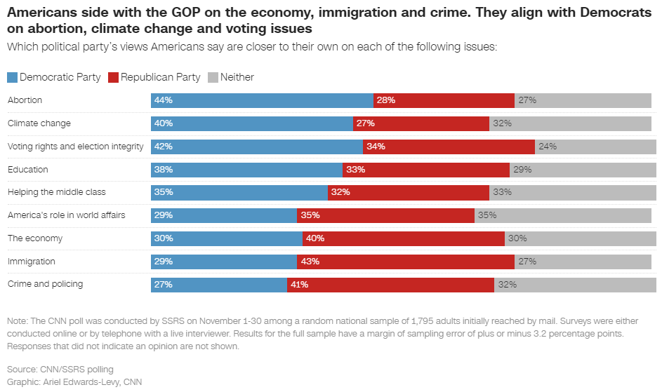 Democratic support for Biden ticks up on handling of Israel-Hamas war Chris Megerian & Linley Sanders, Associated Press Fifty-nine percent of Democrats approve of Biden’s approach to the conflict, a tick up from 50% in November. Still, the issue remains divisive among Democrats, who are less enthusiastic about Biden’s handling of the war than his overall job performance. Seventy-five percent of Democrats said Biden is doing well as president, also up slightly from 69% last month. His approval rating among U.S. adults stands at 41%. CNN Poll: Biden’s job approval has dropped since start of the year as economic concerns remain prevalent Ariel Edwards-Levy, CNN Americans’ views of President Biden’s job performance have ebbed since the start of the year, a new CNN poll conducted by SSRS finds. The public’s views of the national economy remain lackluster, with more than 4 in 10 saying they’re seriously concerned rising costs could push them out of their own communities. Roughly 4 in 10 Americans say the economy or the cost of living is the most important issue facing the country, far above the share who name any other issue, and few express optimism about where the economy is headed.