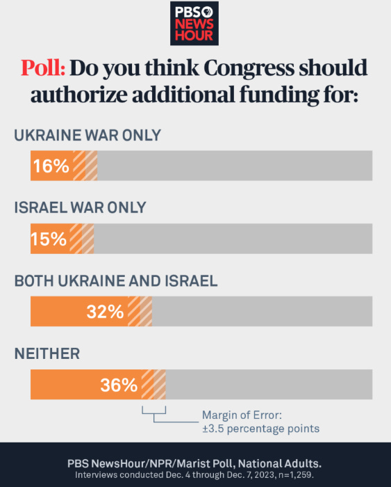 Where voters stand on more funding for Ukraine and Israel Laura Santhanam, PBS NewsHour As Ukrainian President Volodymyr Zelenskyy visits Washington to ask lawmakers for more money to fight Russia, 36 percent of Americans say that the United States should not authorize more funds for war in either Ukraine or Israel, according to the latest PBS NewsHour/NPR/Marist poll. If registered voters were casting ballots for the 2024 presidential race today, 49 percent said they would support Biden, another 48 percent said they backed Trump.