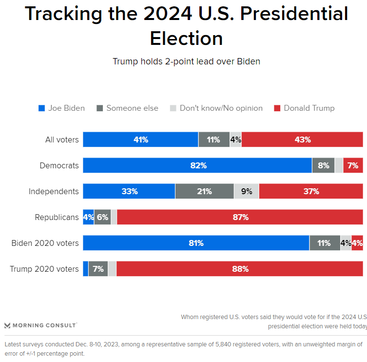 Biden trails Trump Cameron Easley, Morning Consult Trump leads Biden by 2 percentage points (43% to 41%) in our latest national tracking survey, compared with a tie in last week’s update. Biden is trailing Trump because fewer voters from his winning 2020 coalition are coalescing behind his re-election bid: 81% of Biden 2020 voters said they’d vote for him if next year’s election were today, compared with 88% of Trump 2020 voters who said they’d vote for Trump again.