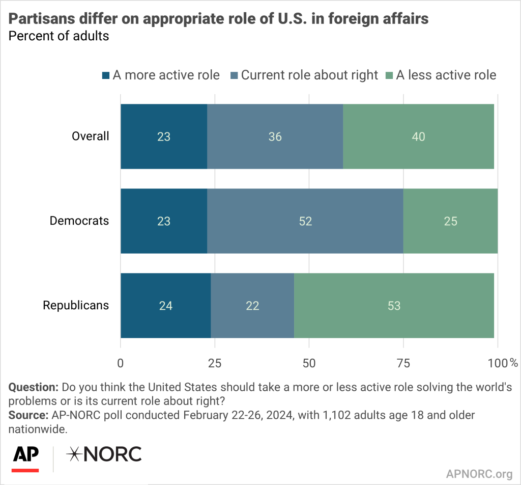 Few want the U.S. to be more active in solving global problems AP-NORC Center for Public Affairs Research Republicans are about twice as likely as Democrats to say the country should be less involved in global issues.