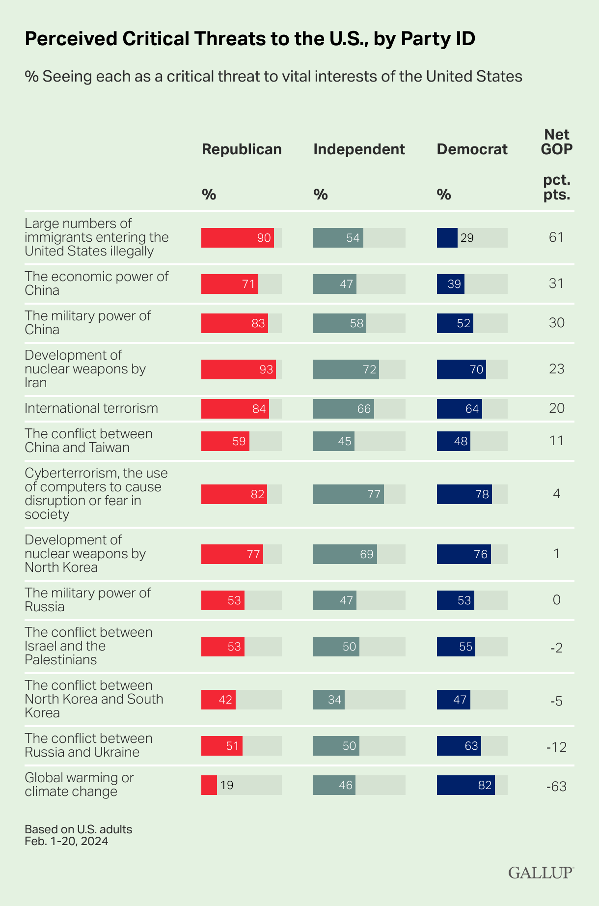 Cyberterrorism, Iran's Nuclear Gains Concern Americans Most Lydia Saad, Gallup More than three-quarters of Americans view cyberterrorism (79%) and the development of nuclear weapons by Iran (77%) as critical threats to U.S. vital interests, making these the top concerns of 13 global issues rated in Gallup’s annual World Affairs survey. Close behind, North Korea’s nuclear program is seen as a critical threat by 73% and international terrorism by 71%.