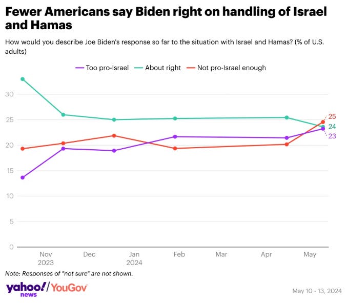 New Yahoo News/YouGov poll: Approval of Biden's handling of Israel-Hamas war falls to new low amid campus protests Andrew Romano, Yahoo News The survey of 1,794 U.S. adults, which was conducted from May 10 to 13, finds President Biden stuck in a lose-lose situation over Gaza. As pro-Palestinian protests rile college campuses and stoke cable news chatter, approval of his handling of the Israeli-Palestinian conflict has fallen to a new low (26%) while disapproval has risen to a new high (60%). No other issue — not inflation, not immigration — tests as poorly for the president at this point.