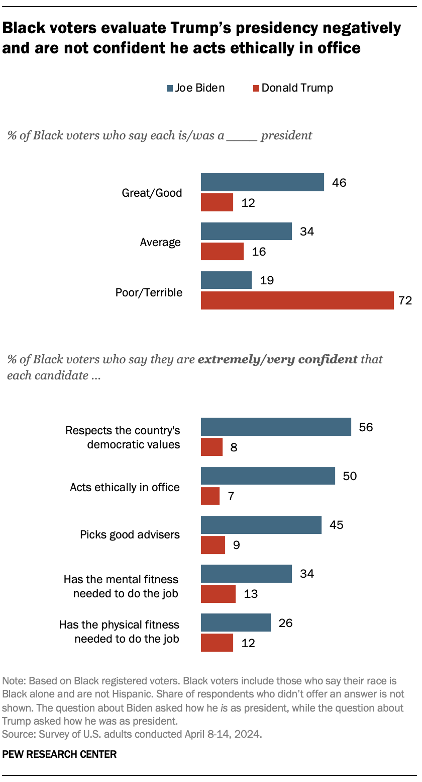An Early Look at Black Voters’ Views on Biden, Trump and Election 2024 Kiana Cox, Pew Research Center Black voters will play a key role in determining the outcome of the 2024 presidential election. And while Black voters remain overwhelmingly Democratic and support Joe Biden over Donald Trump by a wide margin, Biden’s advantage among this group is not as wide as it was four years ago.