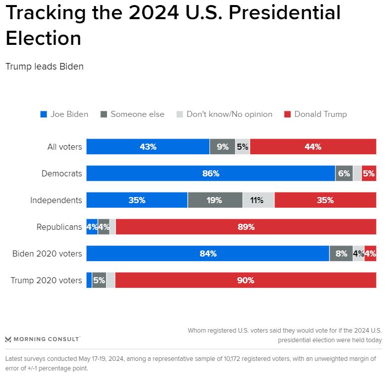 Half of Americans oppose immigrant detention camps, Reuters/Ipsos poll finds Ted Hesson & Jason Lange, Reuters About half of U.S. voters oppose putting immigrants in the country illegally into detention camps while awaiting deportation, a new Reuters/Ipsos poll shows, suggesting Americans may be wary of harsher enforcement plans Donald Trump is considering. Tracking the 2024 Presidential Election Cameron Easley & Eli Yokley, Morning Consult Trump leads Biden by 1 percentage point in our latest tracking, 44% to 43%, matching last week’s data. This is the third successive week in which Biden’s net favorability rating has bettered Trump’s — the longest such stretch since April 2023.