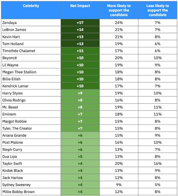 Polling With The Stars: The Celebrity Endorsements Most Likely to Move Young Voters Blueprint As part of a recent poll about young voters and their top issues related to the 2024 election, Blueprint rolled out the red carpet and determined which celebrity endorsements would most influence their presidential vote.