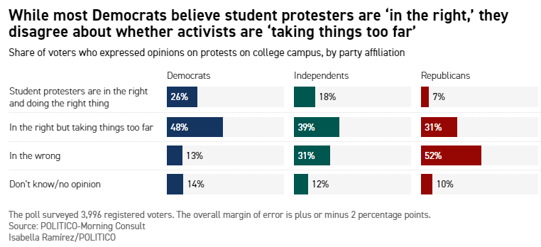 Democrats fractured over views of pro-Palestinian campus protests, poll finds Jared Mitovich, Isabella Ramirez & Juan Perez Jr., Politico