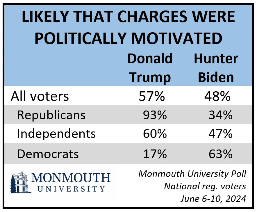 Trials Have Little Impact on 2024 Race Monmouth University Polling Institute More voters agree than disagree with a New York jury’s guilty verdict against former President Donald Trump. What does that mean for preferences in the upcoming election? Very little, according to the latest Monmouth University Poll. Trump and President Joe Biden continue to draw almost identical levels of support, although voter enthusiasm for this rematch has increased among both Republicans and Democrats. The poll also finds that most voters think the criminal charges against Trump were politically motivated, while nearly half say the same about the recent trial involving the current president’s son, Hunter Biden.