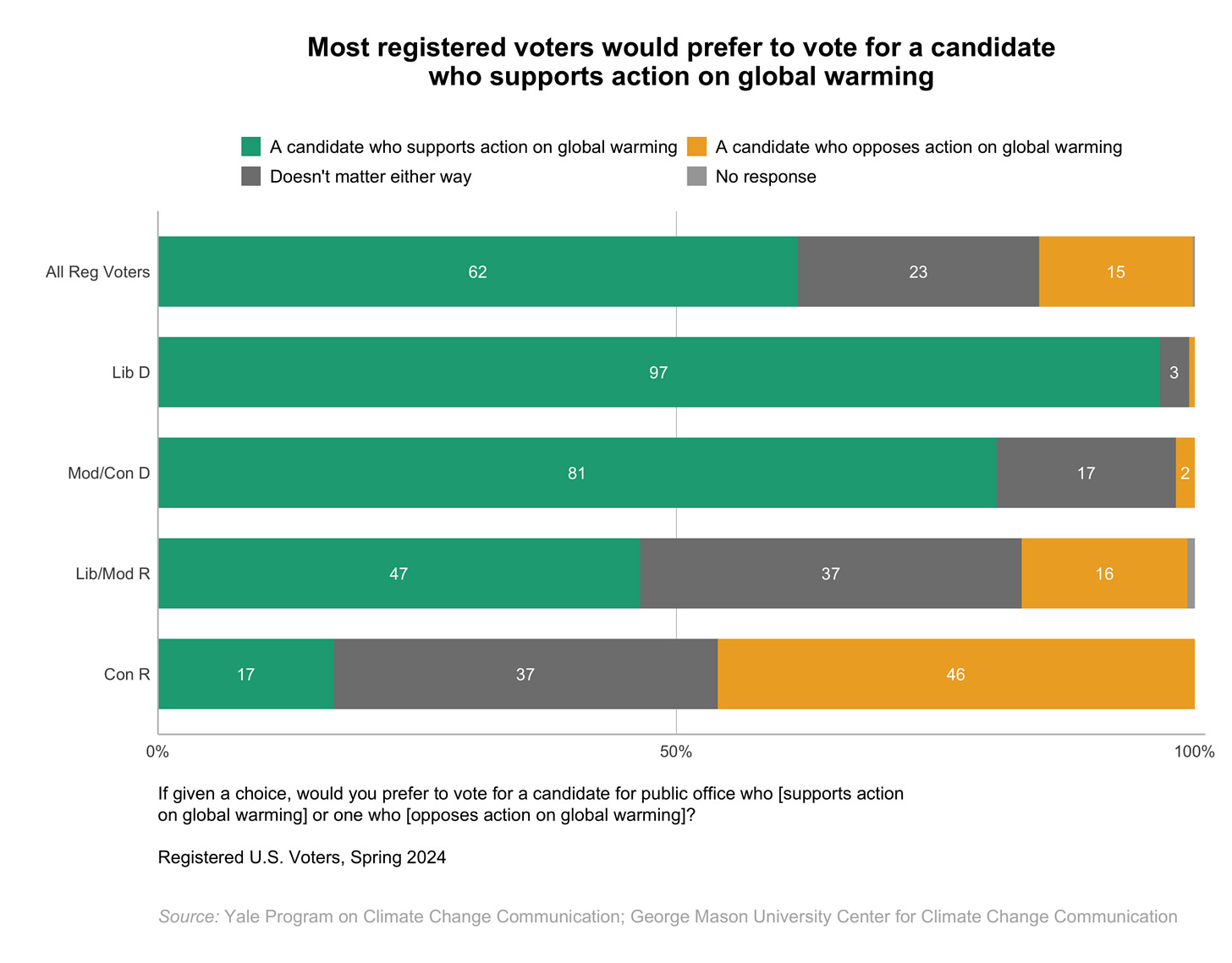 Biden vs. Trump: Who is leading the polls? Jason Lange, Reuters Donald Trump, the Republican challenger in the U.S. presidential contest, opened up a marginal 2 percentage point lead over U.S. President Joe Biden this week in the race to win the November election, as voters weigh the recent criminal convictions of Trump and of Biden's son, according to a new Reuters/Ipsos poll. Climate Change in the American Mind: Politics & Policy, Spring 2024 Yale Program on Climate Change Communication and George Mason University Center for Climate Change Communication 62% of registered voters would prefer to vote for a candidate for public office who supports action on global warming. About four in ten registered voters (39%) say a candidate’s position on global warming will be “very important” when they decide who they will vote for in the 2024 presidential election. Of 28 issues asked about, global warming is the 19th most highly ranked voting issue among registered voters (based on the percentage saying it is “very important”). 39% of registered voters have heard either “a lot” (11%) or “some” (28%) about the Inflation Reduction Act. After reading a short description of the IRA, 74% of registered voters support it.