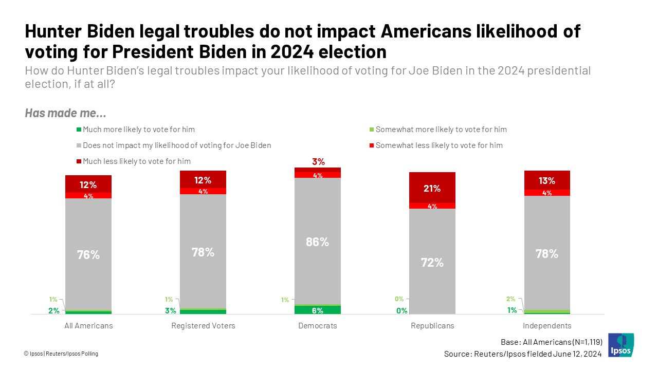 Majority of registered voters unphased by Hunter Biden verdict Ipsos The latest Reuters/Ipsos poll—which began fielding after the announcement of a guilty verdict in the federal felony gun purchasing trial against Hunter Biden—shows that a majority of Americans across party lines believe the trial was conducted fairly. That said, most Americans believe Hunter Biden should have to spend time in prison for lying about his drug use in order to buy a gun.