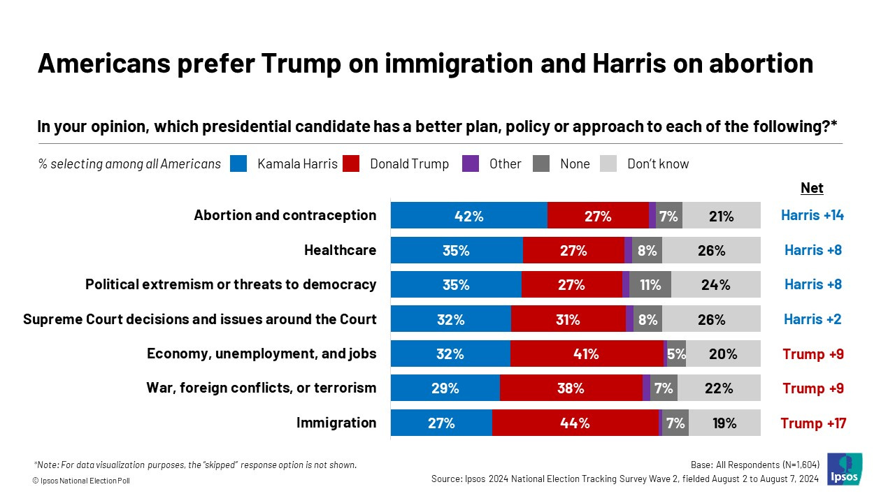 Nationally, Harris holds a small lead over Trump Ipsos A new Ipsos poll finds Vice President Kamala Harris has a slight lead over former President Trump in the race for the presidency. However, when non-Harris and Trump voters are forced to choose between the two candidates, the race between Harris and Trump becomes too close to call.