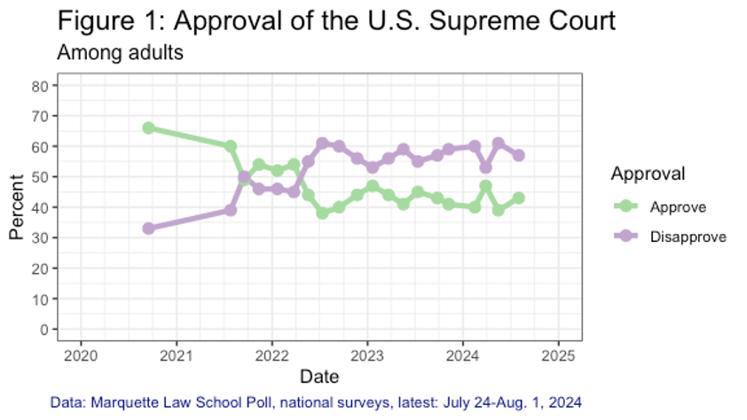 Americans Widely Oppose ‘Project 2025’ University of Massachusetts Amherst With the Republican and Democratic tickets now set for this November’s presidential election and voters ready to examine the candidates’ respective platforms, a new national University of Massachusetts Amherst Poll has found that the policies associated with the Heritage Foundation’s “Project 2025” are deeply unpopular among Americans. Uptick in approval of U.S. Supreme Court, but disapproval remains above 50% Charles Franklin, Marquette Law School Poll Majority of those polled view justices’ decisions as motivated mostly by politics, while opinion is divided on the Court’s honesty and ethics