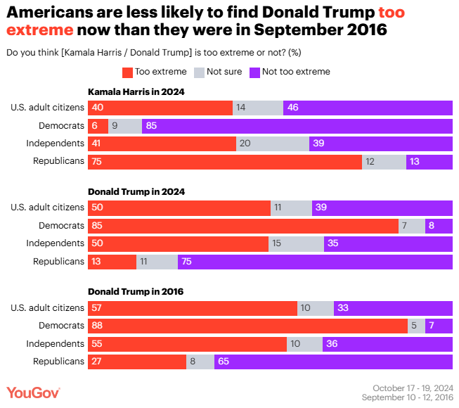 Trump gains with Hispanic men, Harris up with white women, Reuters/Ipsos polls show Jason Lange and Bo Erickson, Reuters Former President Trump now trails Vice President Harris by just 2 percentage points among Hispanic men - 44% to 46% - compared with his 19 point deficit with Democrat Joe Biden at the same point in 2020, according to the analysis of more than 15,000 responses to Reuters/Ipsos polls conducted in the month through Oct. 21 and during the same period of 2020. New polling finds Harris gaining with a group she has struggled with: Black men Asma Khalid, NPR News A new NAACP survey offers a mixed picture for the vice president. She has gained ground among Black men since August, but about one in five say they are still backing former President Donald Trump. Republicans are more likely than Democrats to be scared about the state of the world Jamie Ballard, YouGov A new YouGov survey finds that most Americans are feeling scared as the election nears, and most are worried about extremism. The candidates themselves are viewed as too extreme by much of the population: 40% say Harris is too extreme and 50% say Trump is.