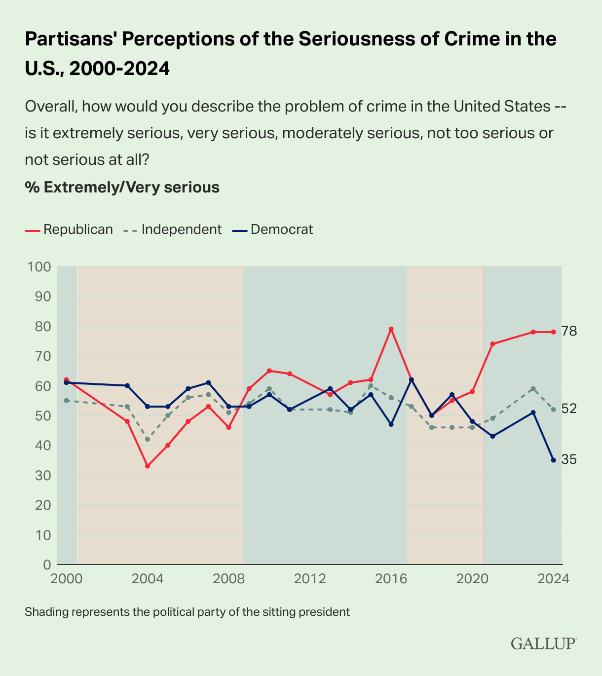 Smaller Majorities Say Crime In U.S. Is Serious, Increasing Megan Brenan, Gallup Americans’ perceptions of crime in the U.S. have improved, with the percentage saying national crime has increased over the past year falling by 13 points, to 64%. Similarly, the 56% of U.S. adults who now say the problem of crime in the U.S. is “extremely” or “very” serious is down seven percentage points.