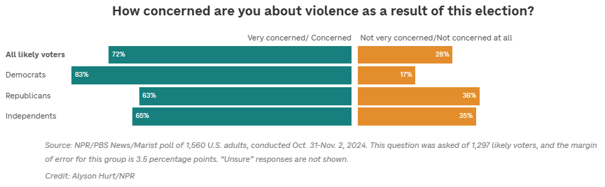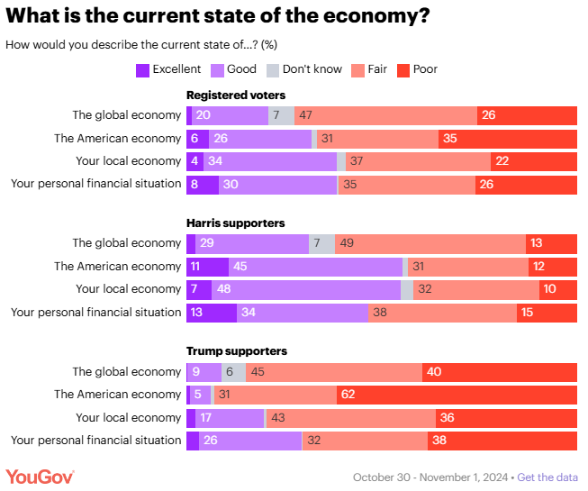 Final college student survey: But will they vote? Generation Lab Our final college student survey in the battleground states of Wisconsin, Michigan, Pennsylvania, North Carolina, Georgia, Nevada and Arizona, finds the following: Kamala Harris (D): 72% / Donald Trump (R): 21% / Jill Stein (G): 5% / Chase Oliver (L): 2% Trump supporters hold a bleak view of the economy heading into the election Taylor Orth & Carl Bialik, YouGov Heading into the 2024 election, many registered voters hold a negative view of the country's economic circumstances. Negative assessments of the American economy are politically polarized: Donald Trump's supporters are far more likely than Kamala Harris' to say the U.S. economy's current state is poor (62% vs. 12%).