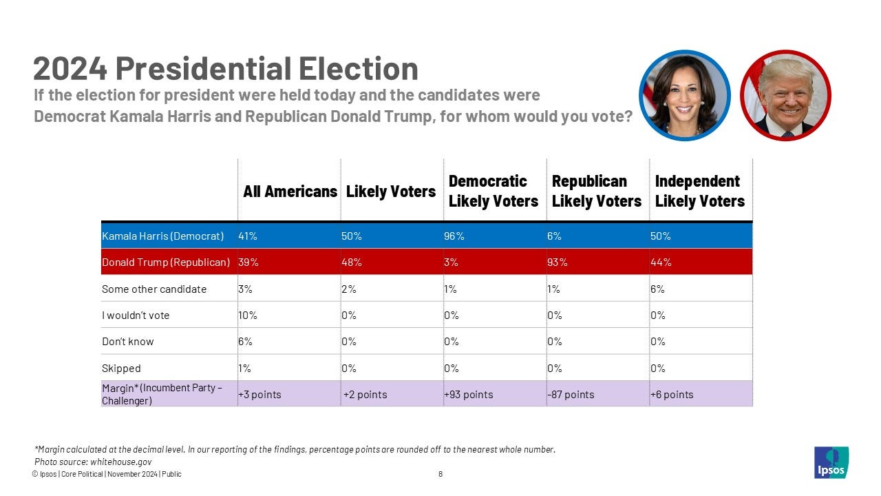 Harris +4 Points Against Trump Nationally Marist Institute for Public Opinion In this final, national NPR/PBS News/Marist Poll before Election Day, Vice President Kamala Harris edges former President Donald Trump among likely voters nationally including those who are undecided yet leaning toward a candidate. Harris and Trump are locked in tight race Ipsos The latest Ipsos Core Political poll finds that Harris and Trump are locked in a tight race among likely voters. The poll, conducted in the final weekend before the election, also shows that Americans remain most concerned about the economy, followed by political extremism or threats to democracy, and immigration.