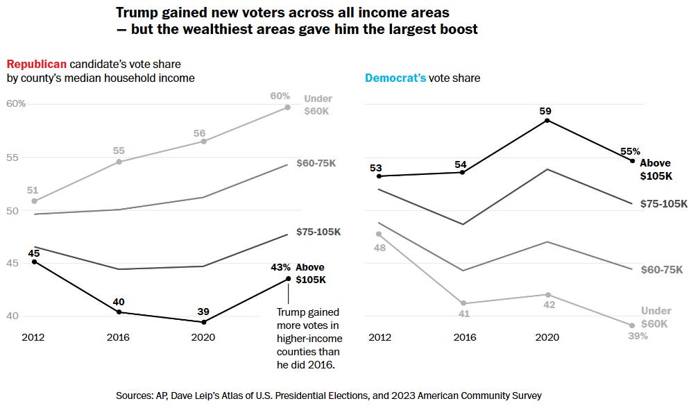 The voter shift that should alarm Democrats most Youyou Zhou and Heather Long, Washington Post [unlocked] Data shows the urban liberal bubble is on the verge of bursting.