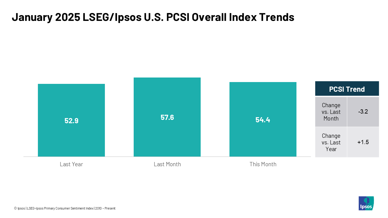 January 2025 LSEG/Ipsos Primary Consumer Sentiment Index Chris Jackson and Johnny Sawyer, Ipsos The LSEG/Ipsos Primary Consumer Sentiment Index for January 2025 is at 54.4. Fielded from December 20, 2024 – January 3, 2025, the Index is down 3.2 points from last month. These findings are based on data from a monthly 29-country survey conducted by Ipsos.