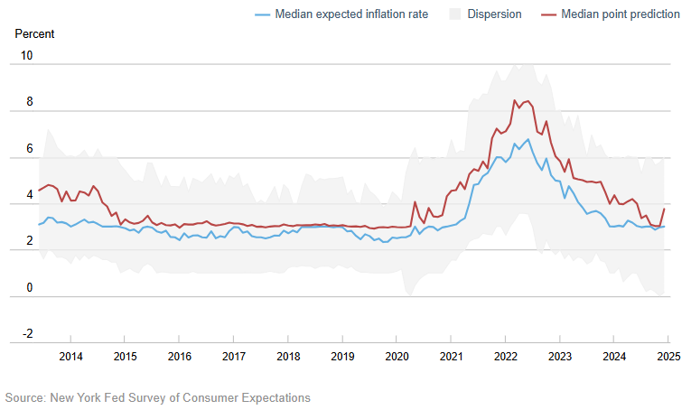 Most Americans say U.S. can’t afford military action in Syria and Ukraine Ipsos Ipsos polling conducted in mid-December in the wake of former Syrian President Bashar Al-Assad fleeing Syria finds that while most Americans agree the U.S. cannot afford to be taking military action in Syria and Ukraine, most also think the U.S. should support democratic countries when attacked. Inflation Expectations Mixed; Job Turnover Expectations Decline Federal Reserve Bank of New York The Federal Reserve Bank of New York’s Center for Microeconomic Data released the December 2024 Survey of Consumer Expectations, which shows that inflation expectations were unchanged at the short-term horizon, increased at the medium-term horizon, and decreased at the longer-term horizon.