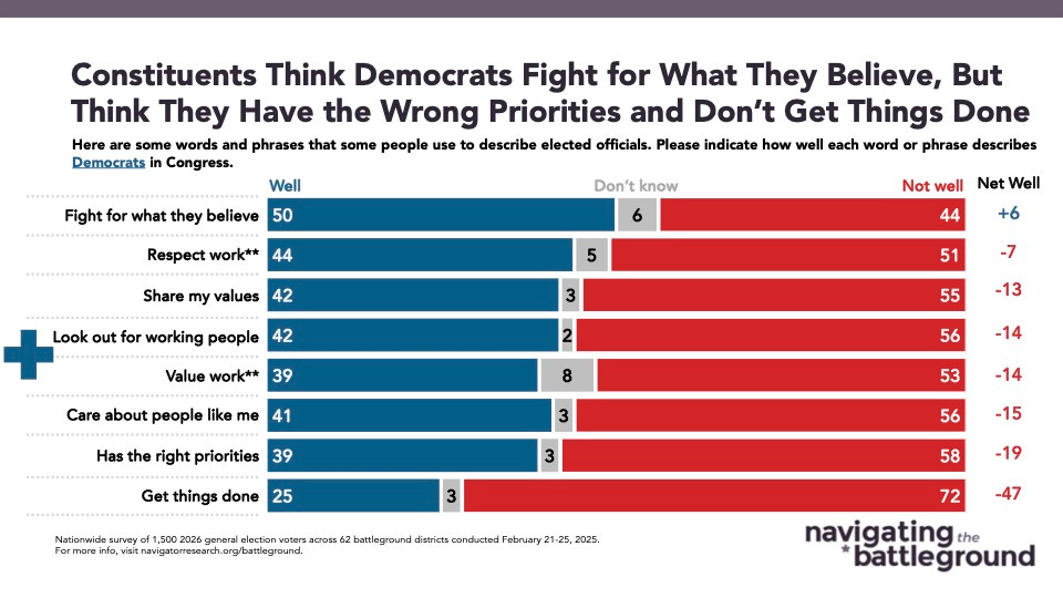 Most AAPI adults don’t support cutting agencies and want a focus on costs: AP-NORC/AAPI Data poll Terry Tang and Linley Sanders, Associated Press Most Asian Americans, Native Hawaiians and Pacific Islanders do not agree with the strategy of putting entire federal agencies on the chopping block, nor are they broadly on board with mass layoffs of federal workers, according to a new poll. Trump Is Losing Trust on the Economy Amid Trade War Eli Yokley, Morning Consult Voters are roughly split on Trump’s handling of the economy and trade policy, marking double-digit declines in his net approval rating on those topics since he took office. Republicans in Congress have seen similar declines in trust on the two issues over the same time period. Just 19% of voters say Trump’s tariffs on America’s top trading partners are primarily about the flow of fentanyl into the U.S., which is the main reason he’s cited. Perceptions of Democrats and Republicans in the Congressional Battleground Ian Smith, Navigator Research This Navigator Research report covers how constituents in House battleground districts rate Democrats in Congress and Republicans in Congress, who they trust more on key issues, and support for various policies they think should be prioritized during this Congress.