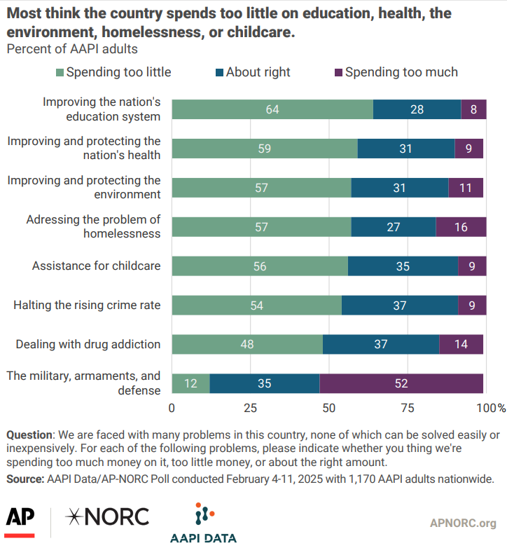 AAPI Data/AP-NORC Poll: Many Think the Government Spends Too Little on Key Policy Areas AP-NORC Center for Public Affairs Research As Congress faces a March 14 deadline to avoid a partial federal government shut-down, a new AAPI Data/AP-NORC Poll finds that most Asian American, Native Hawaiian, and Pacific Islander (AAPI) adults think the federal government should prioritize addressing the costs of health care (79%), food (67%), and housing (61%). Many believe the government is spending too little on a variety of policy areas, with education (64%) and healthcare (59%) topping the list.