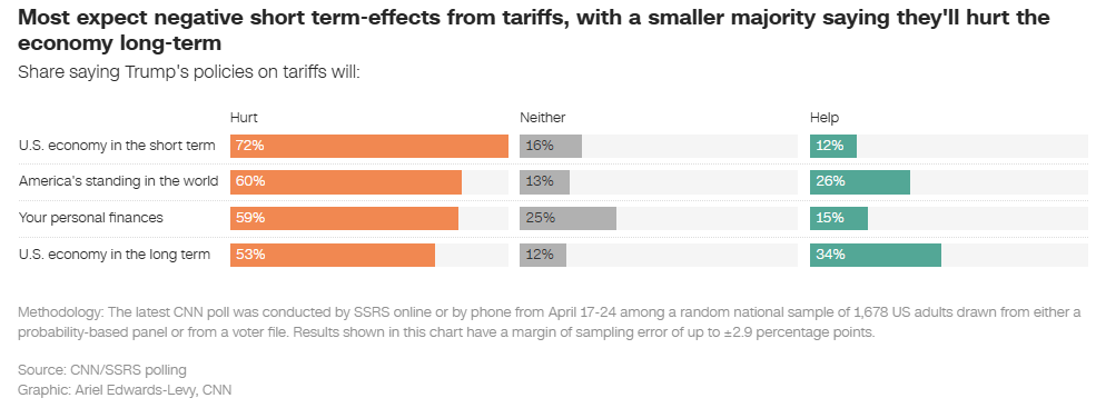 CNN Poll: A growing majority says Trump has made the economy worse, with most skeptical of his tariff plans Ariel Edwards-Levy, CNN A 59% majority of the public now says President Donald Trump’s policies have worsened economic conditions in the country, according to a new CNN poll, up from 51% in March.