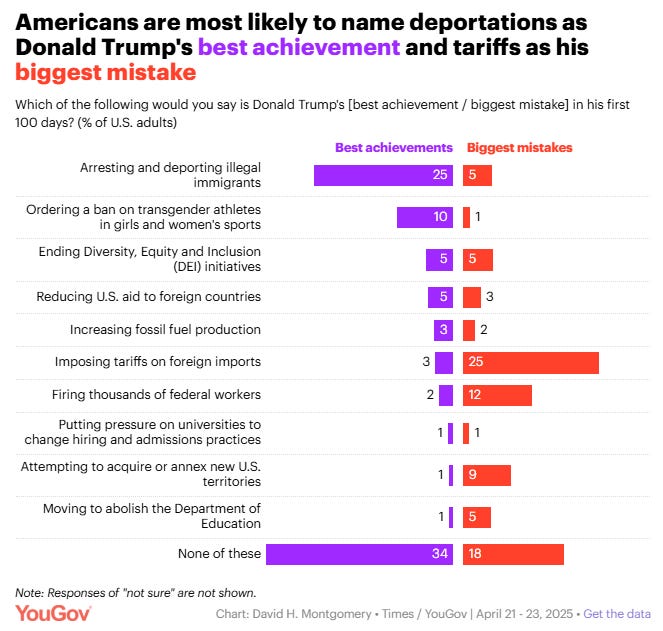 Times Poll finds widespread dissatisfaction with first 100 days of Donald Trump's second term Mark Blumenthal, YouGov A YouGov poll of 1,296 U.S. adults between April 21 - 23, 2025 — conducted for the Times — shows widespread dissatisfaction with the first 100 days of Donald Trump's second term as president. The disapproval of Trump extends from major issues, especially his handling of tariffs and government workers, to less-substantive ones such as golf and the Oval Office.