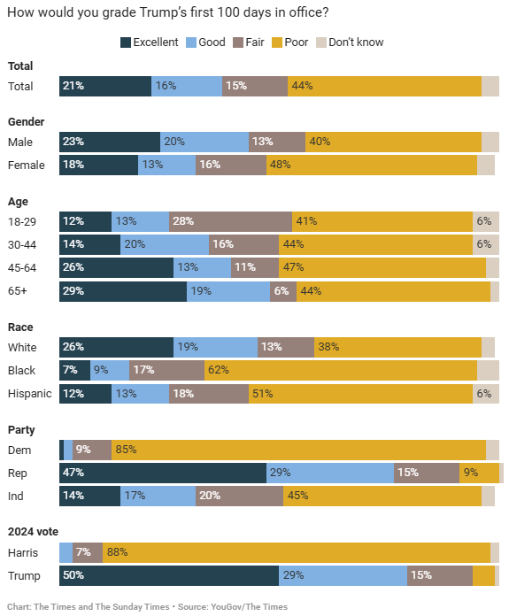 You’re failing on the economy, Americans tell Trump in Times poll David Charter, The Times Americans have delivered a verdict on the first 100 days of President Trump’s second term in an exclusive YouGov poll for The Times. The survey of a 1,296-strong representative sample of adults on April 21-23, in advance of Trump’s 100th day in office on Tuesday, yields a series of revelations ranging from voters’ economic woes to which of the president’s policies have proven most and least popular.