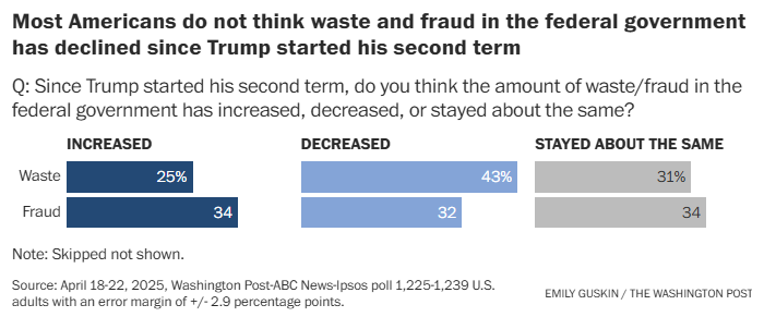Public sours on Musk’s role, is skeptical that government is cutting waste Emily Guskin and Scott Clement, Washington Post [unlocked] Thirty-five percent of Americans approve of the way Musk is handling his job in the Trump administration, while 57 percent disapprove, a Washington Post-ABC News-Ipsos poll shows.
