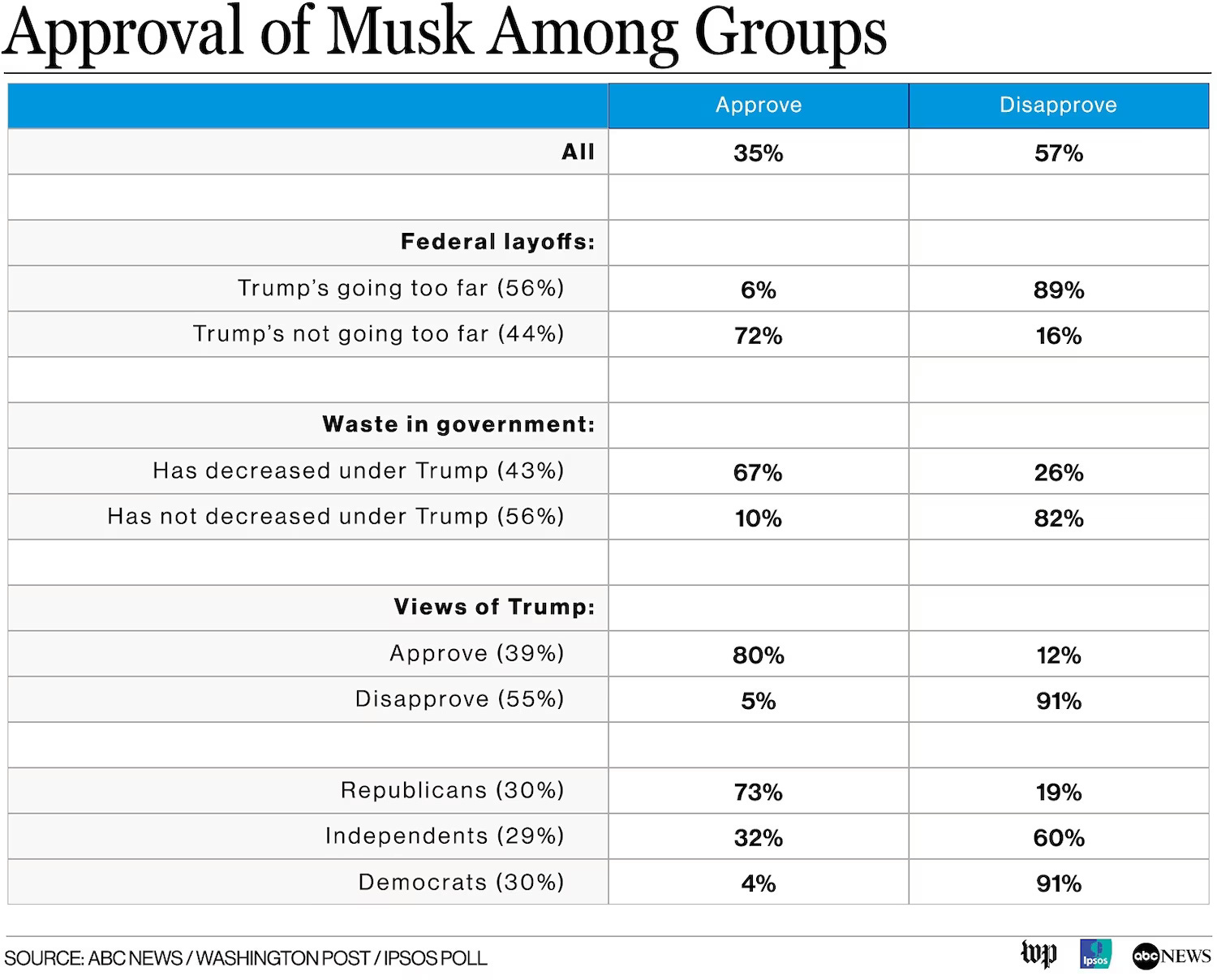 Elon Musk approval low, reflecting opposition to Trump cuts Jaclyn S. Wong, ABC News Elon Musk is well underwater in public views of his work for President Donald Trump, according to a new ABC News/Washington Post/Ipsos poll. Thirty-five percent of Americans said they approve of his job performance for the Trump administration, while 57% said they disapprove, roughly on par with ratings for the president himself.