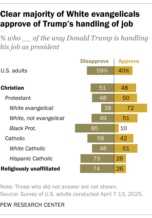 Young independents grapple with frustration over the two-party system Maya Eaglin, NBC News Results from the NBC News Stay Tuned Poll illustrate the depths of exasperation with Democrats and Republicans among independents of all ages. White evangelicals continue to stand out in their support for Trump Chip Rotolo, Pew Research Center Roughly three months into President Donald Trump’s second term, White evangelical Protestants continue to be among his strongest supporters. Here’s a closer look at how White evangelicals and other major U.S. religious groups view the second Trump administration, based on a Pew Research Center survey of 3,589 U.S. adults conducted April 7-13, 2025.