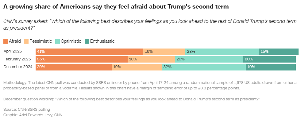 CNN Poll: Frustrated Americans want more checks on Trump, have dim views of Democratic opposition Jennifer Agiesta and Emily R. Condon, CNN The American public is frustrated, disappointed and increasingly angry at the state of politics 100 days into Donald Trump’s second term in the White House, according to a new CNN poll conducted by SSRS, with neither party positioned to change the mood.