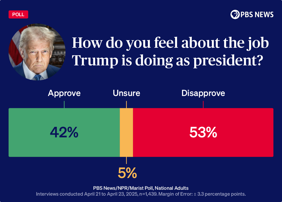 How Americans grade Trump’s first 100 days Joshua Barajas, PBS NewsHour As President Donald Trump celebrates his first 100 days in office, a new PBS News/NPR/Marist poll finds that a plurality of Americans give him a failing grade. Forty-five percent of U.S. adults rated Trump’s return to the Oval Office an “F,” including 80 percent of Democrats and 49 percent of independents. A majority of Americans — 53 percent — disapprove of his leadership.