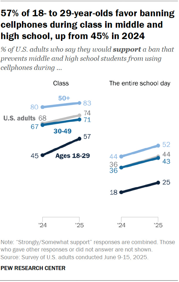 Americans’ support for school cellphone bans has ticked up since last year Jeffrey Gottfried, Eugenie Park and Monica Anderson, Pew Research Center As the new school year approaches and lawmakers across the country decide whether to enact cellphone bans in schools, Americans’ support for such bans is inching up. Today, 74% of U.S. adults say they would support banning middle and high school students from using cellphones during class, up from 68% last fall.