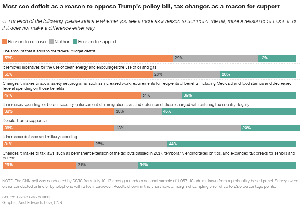 Roughly 6 in 10 Americans oppose Trump’s megabill, CNN poll finds Ariel Edwards-Levy, CNN Roughly 6 in 10 Americans say they oppose the GOP domestic policy bill that President Donald Trump recently signed into law, according to a new CNN poll conducted by SSRS. In the wake of his most sweeping legislative achievement since returning to office, Trump’s rating for handling the budget has slumped 11 points since March, with a rising majority also saying he’s gone too far in cutting government programs.
