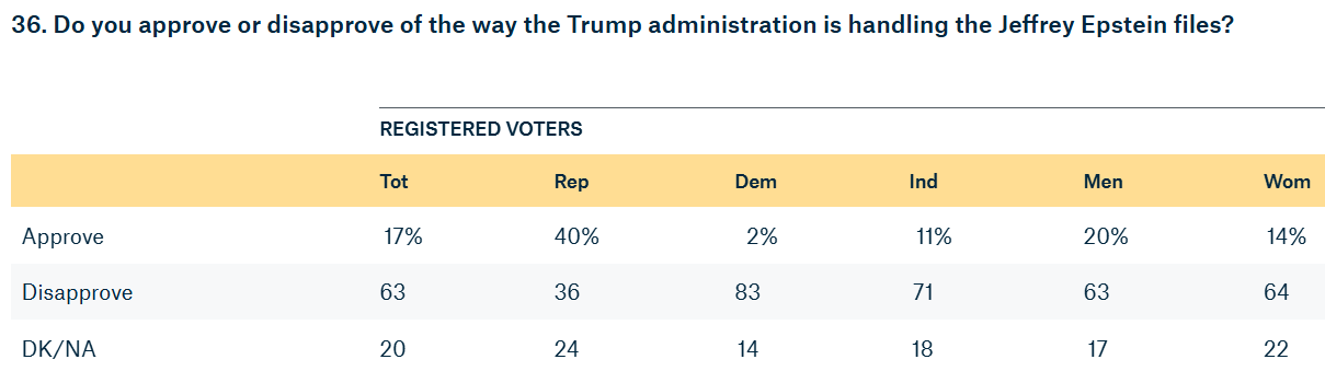 63% Of Voters Disapprove Of The Trump Administration's Handling Of Epstein Files Quinnipiac University Poll A week after the Justice Department and the FBI effectively closed the investigation into convicted sex offender Jeffrey Epstein by releasing no new files and concluding that he died by suicide in his jail cell, 17 percent of voters say they approve of the way the Trump Administration is handling the Jeffrey Epstein files, while 63 percent of voters disapprove. Forty percent of voters approve of the way Donald Trump is handling his job as president, while 54 percent disapprove. A majority of voters (55 percent) oppose the Republican tax and spending bill named One Big Beautiful Bill Act that was passed by Congress and signed into law, while 35 percent support it.