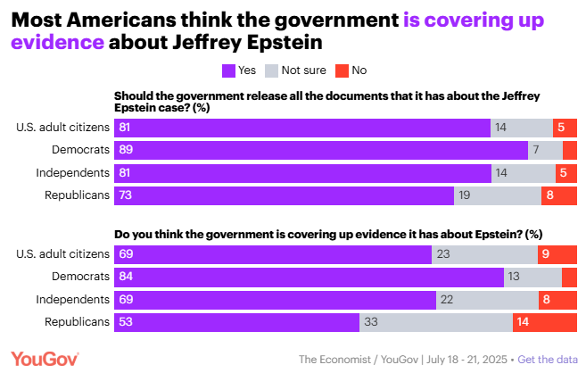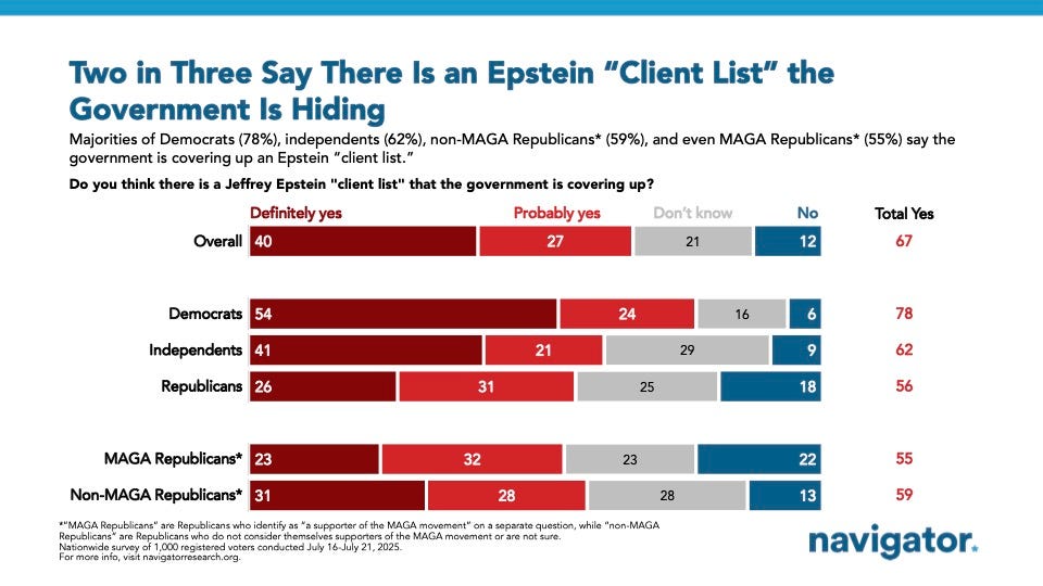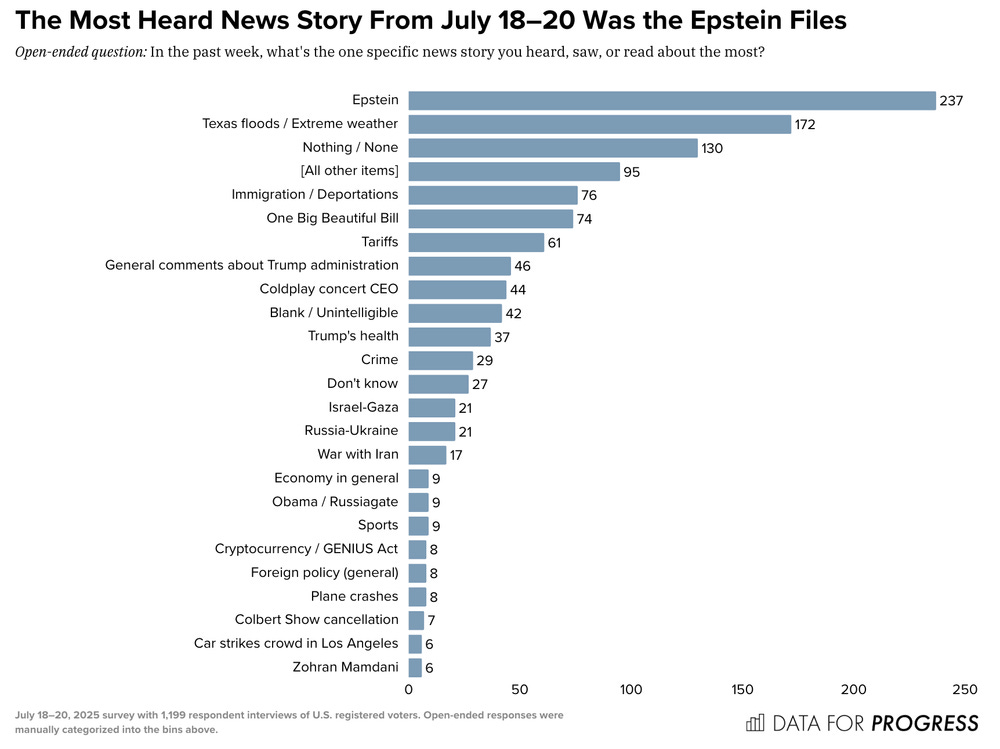The Epstein Story Continues to Break Through to Voters Data for Progress New Data for Progress polling finds that despite Trump’s best efforts to distract his followers from the case, the Epstein files continue to be one of the biggest stories breaking through to voters. In a poll conducted July 11-12, Data for Progress found that 25% of voters had heard “a lot” about the Epstein files. In a new survey, conducted July 18-20, we now find that 37% of voters have heard “a lot” about the story.