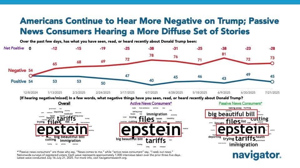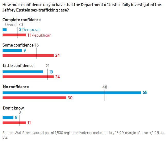 Resilient Trump Lifted by Improved View of the Economy, WSJ Poll Finds Aaron Zitner, Wall Street Journal [unlocked] Buoyed by voters’ improving views of the economy, President Trump’s political standing is showing notable resilience, a new Wall Street Journal poll finds, despite the unpopularity of the GOP’s big tax-and-spending law, dissatisfaction with Trump’s tariff plan and high suspicion that the government is hiding important information about its investigation into Jeffrey Epstein.