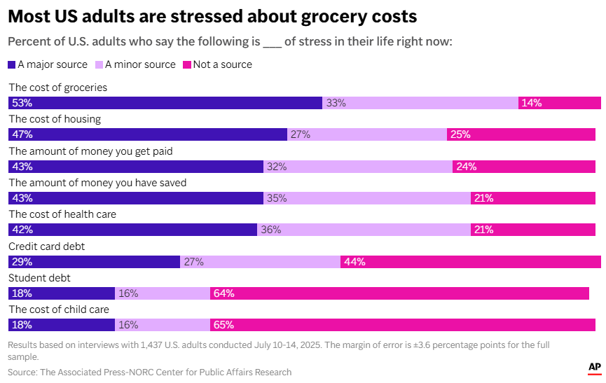 The vast majority of US adults are stressed about grocery costs, an AP-NORC poll finds Cora Lewis and Linley Sanders, Associated Press The vast majority of U.S. adults are at least somewhat stressed about the cost of groceries, a new poll finds, as prices continue to rise and concerns about the impact of President Donald Trump’s tariffs remain widespread.