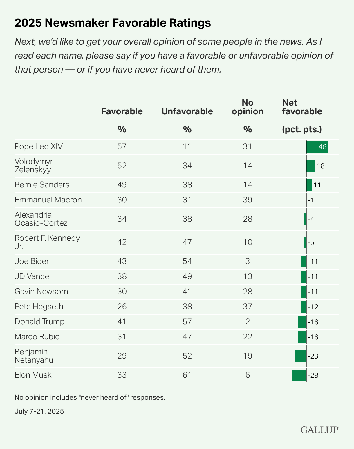 Pope Leo Most Favorably Viewed of 14 Newsmakers Lydia Saad, Gallup Among 14 prominent U.S. and global figures, Pope Leo XIV has the most positive image by far, with many more Americans viewing him favorably than unfavorably. His 57% favorable rating and 11% unfavorable rating result in a +46 net-favorable score, far ahead of Ukrainian President Volodymyr Zelenskyy (+18) and U.S. Sen. Bernie Sanders (+11).
