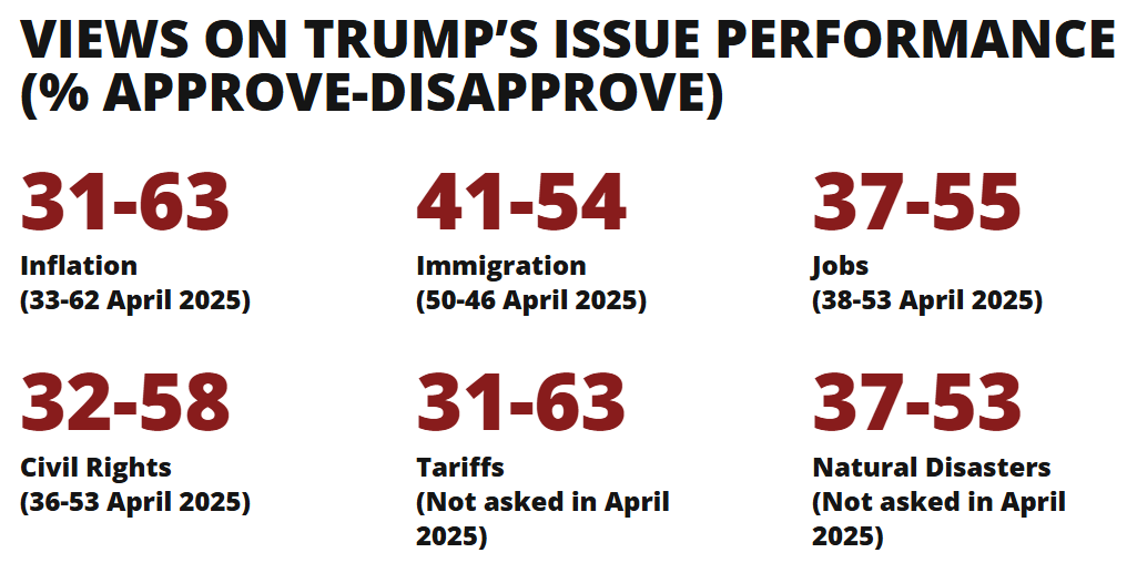 Public approval of Trump’s presidency has dropped by 6 percentage points since April University of Massachusetts Amherst Poll Public approval of Donald Trump’s presidency has dropped by 6 percentage points since April and his approval rating is now 20 points underwater, 38-58, according to a new national University of Massachusetts Amherst Poll of 1,000 respondents conducted July 25-30. “Trump came into the presidency promising change, and he’s made significant alterations in many areas of federal policy,” says Jesse Rhodes, professor of political science at UMass Amherst and co-director of the poll. “Clear majorities say that Trump has handled his key issues – immigration (54%), inflation (63%), jobs (55%) and tariffs (63%) – not very well or not well at all. With so many Americans grading his handling of public policy poorly, it’s no wonder they disapprove of his presidency.”