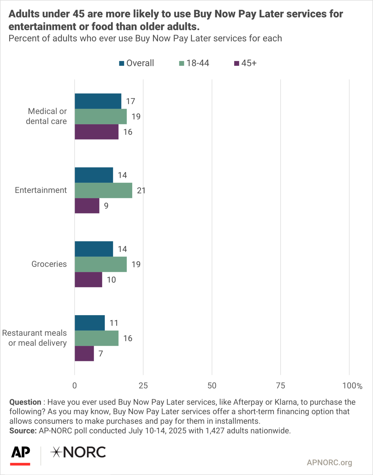 Food, housing, and health care costs are a source of major stress for many people AP-NORC Center for Public Affairs Research About half the public identify the cost of groceries as a major source of financial stress. Nearly 1 in 5 of them have used so-called Buy Now Play Later services to buy their groceries.
