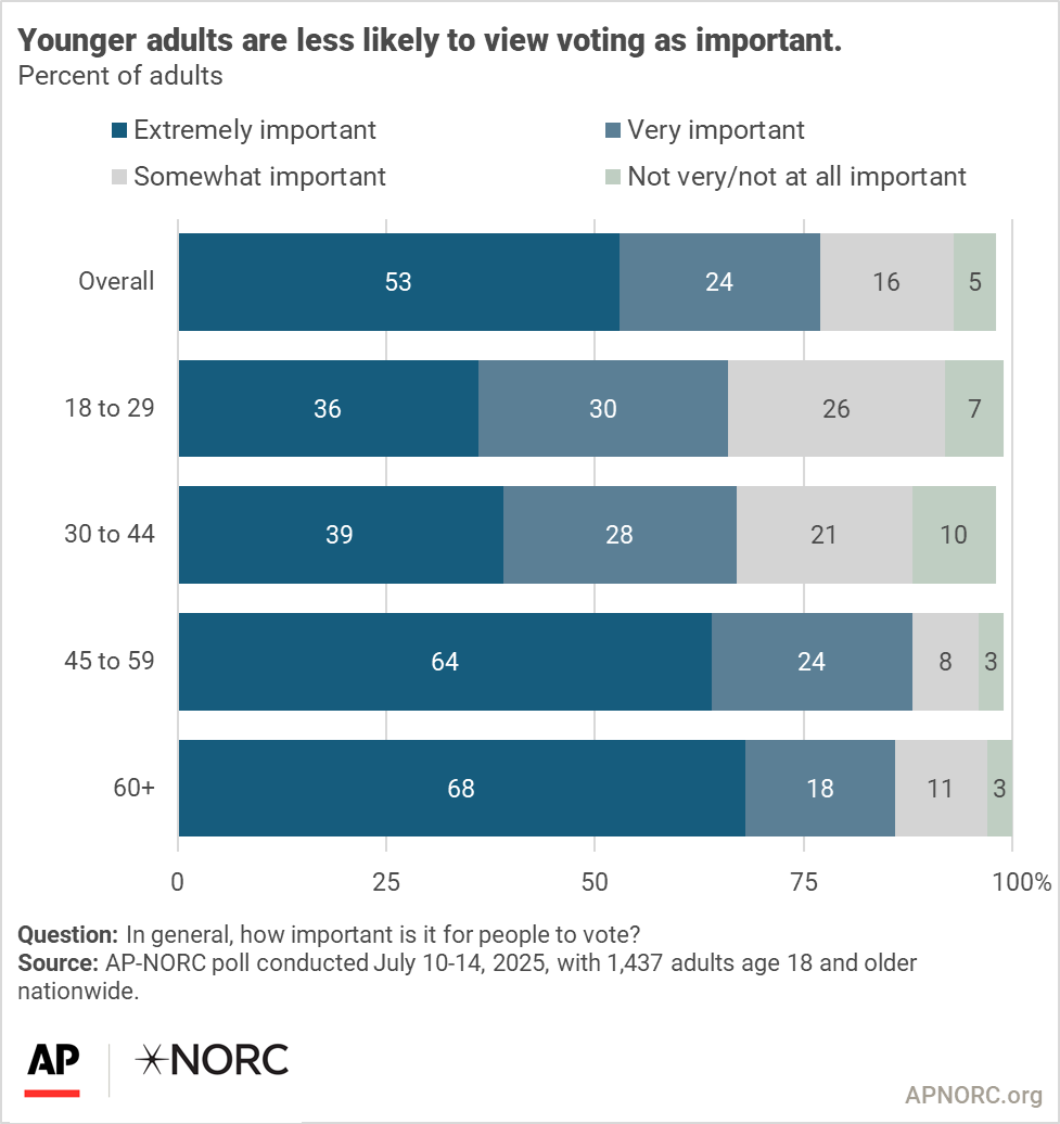 Young adults are less likely to follow politics or say voting is important: AP-NORC poll Nicholas Riccardi, Linley Sanders and Amelia Thomson-Deveaux, Associated Press